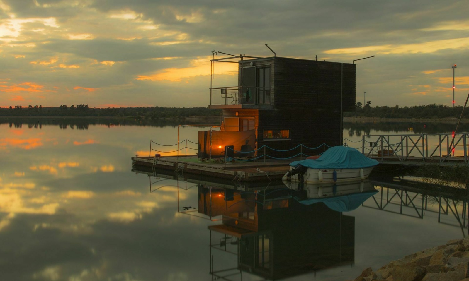 TOP 2 Jezero Partwitzer See: Západ Slunce z terasy plovoucího domu