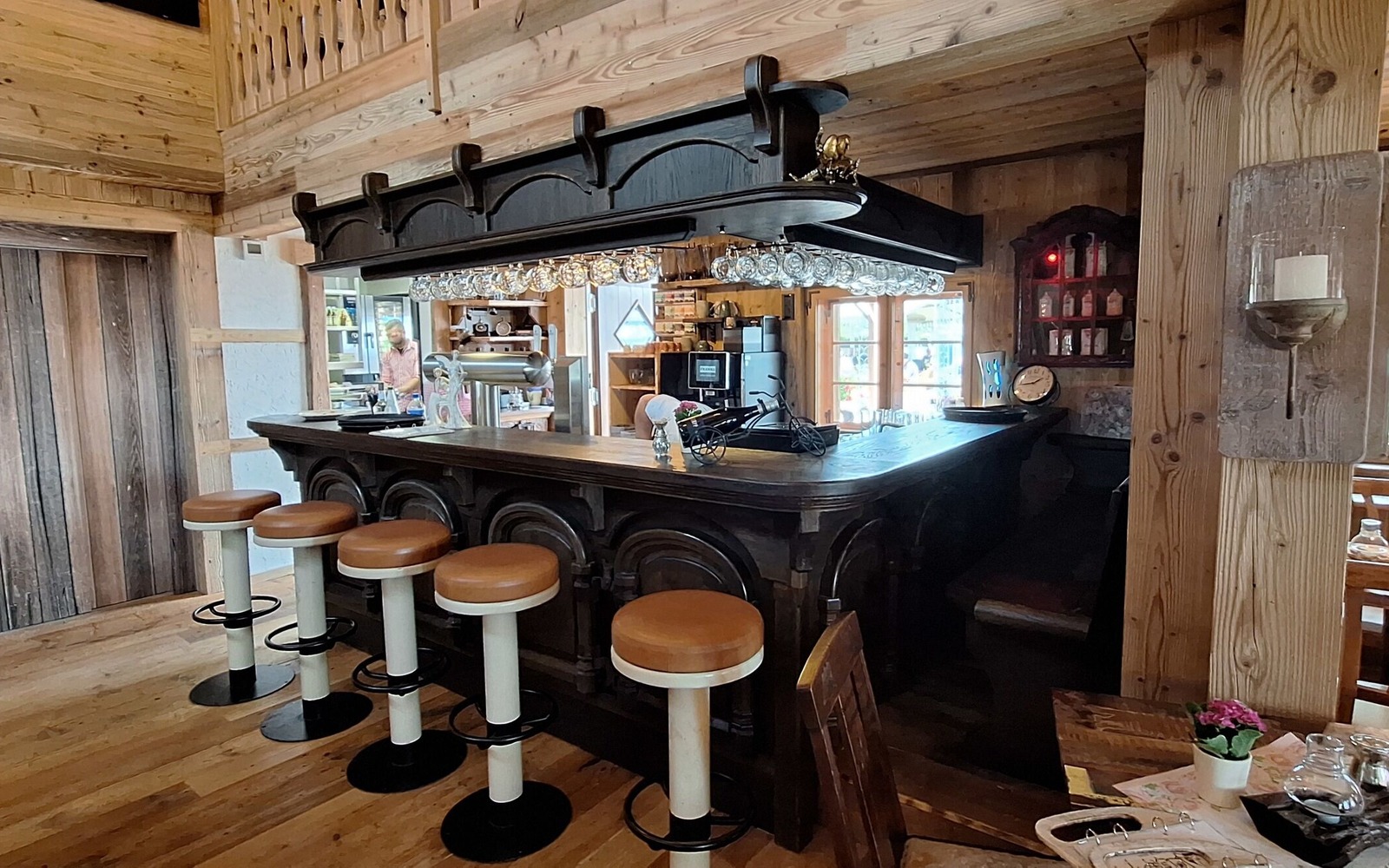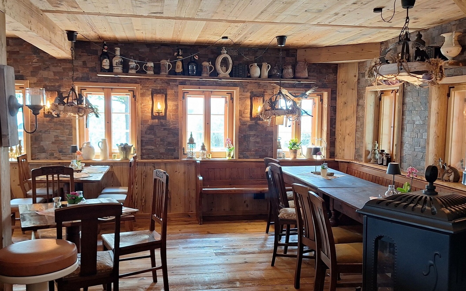 In der Lutki-Hütte finden bis zu 50 Gäste in einem ebenerdigen Gastbereich und einer kleinen Galerie auf der Empore gemütlich Platz.