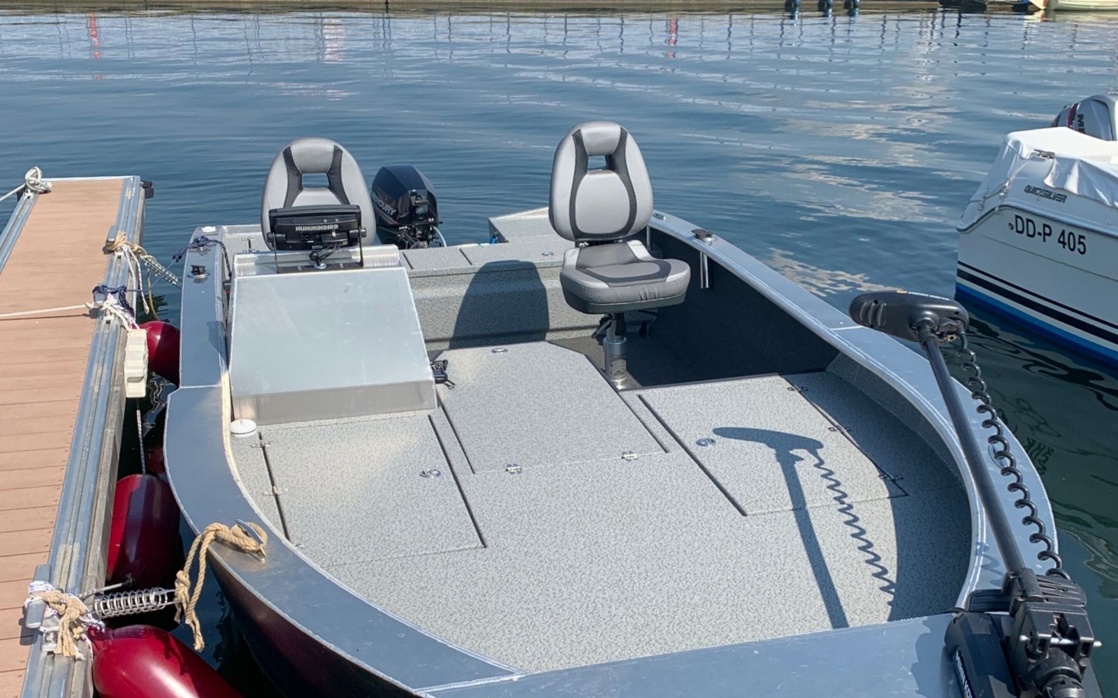 Das führerscheinfreie Aluminiumboot Pike Hunter 530 ist ausgestattet mit einem 8- Zoll Humminbird Echolot, einem 15 PS Motor, ein Bugmotor I-Pilot sowie einem Kescher.