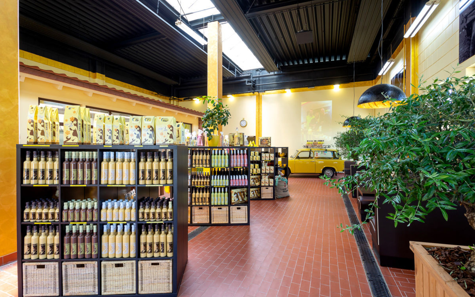 All current varieties can be tasted and purchased in the scharfesGelb shop in Senftenberg, located next to the bottling plant. Also on offer is a wide range of accessories, including glasses, pumps, gift ideas, gift packages, and scharfesGelb shirts, not to mention chocolate pralines and jam with advocaat.