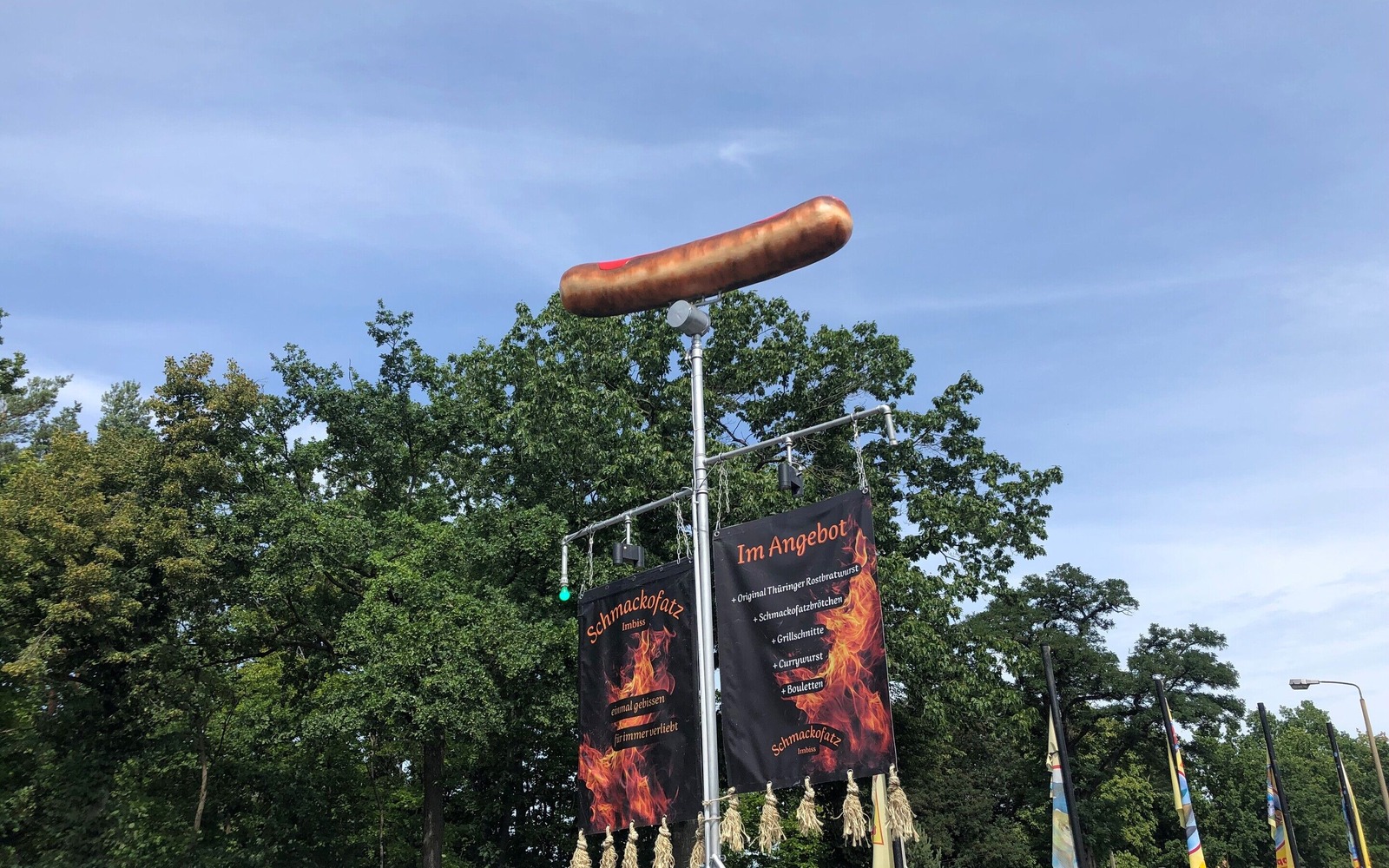 On Dresdner Straße (B97) in Hoyerswerda, hungry guests can enjoy a very special snack. Schmackofatz is a barbecue stand with exceptional recognition value. The snack bar's impressive trademark is visible from afar – a rotating Thuringian bratwurst over two meters long on a six-meter-high pedestal.