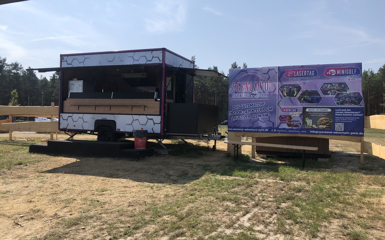 The Seenland Adventure Park snack bar is located above the beach area at Scheibe-See near Hoyerswerda. In the immediate vicinity there is a parking lot with additional e-charging stations, the circular lake trail and a public barrier-free mobile toilet. There is also a new playground for younger guests within sight of the food truck. In addition to cool drinks, hearty dishes such as currywurst, bockwurst, bratwurst or meat loaf with bread rolls or pasta salad are also available. Visitors should note that the snack bar is only open from midday during the summer season when the weather is fine.