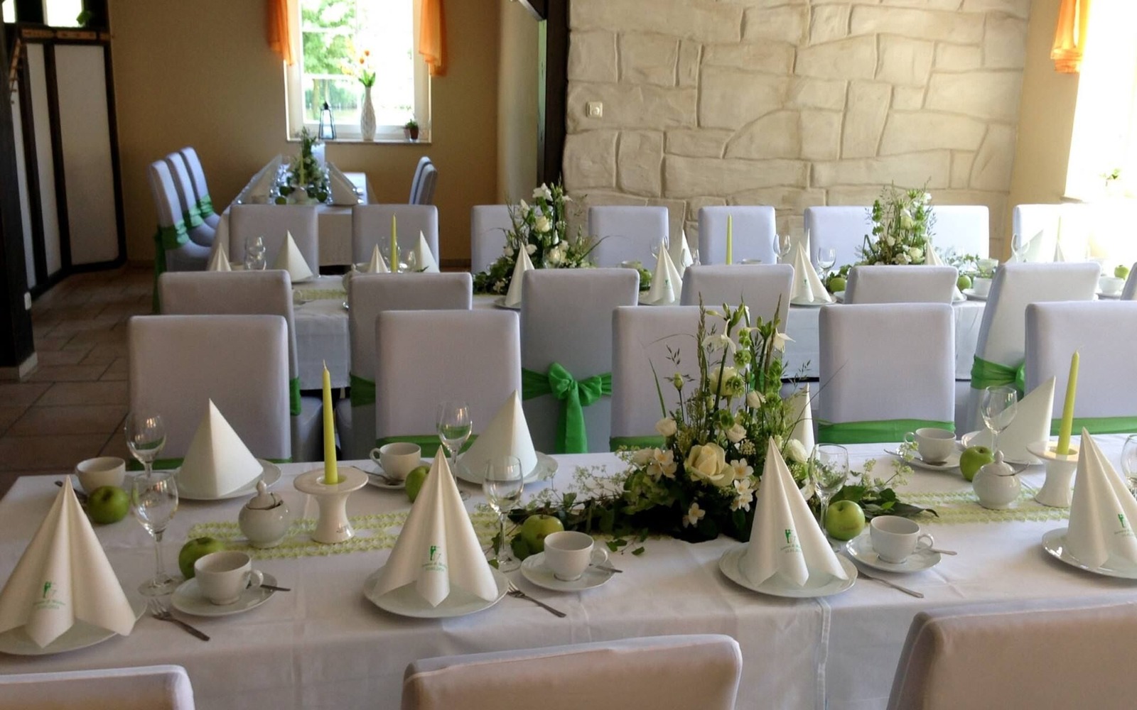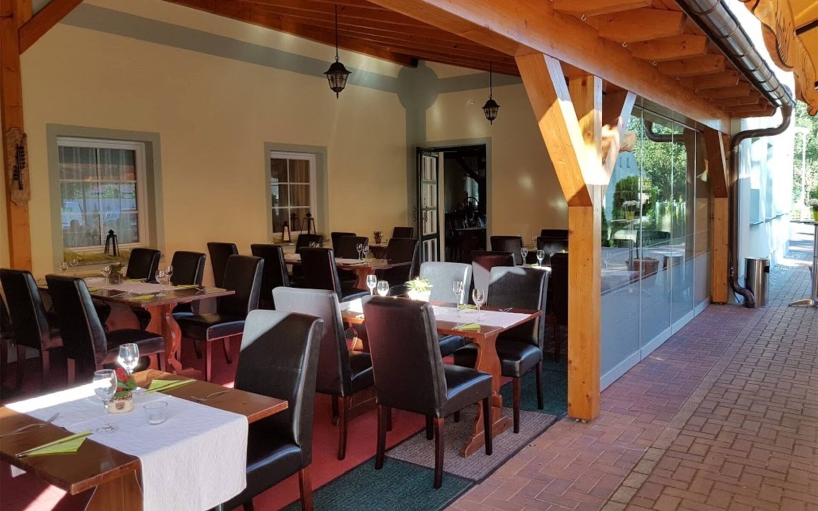 Family celebrations, weddings or birthdays with up to 80 people can be celebrated in the interior of the restaurant. There is space for up to 90 people in day-to-day business. Around 60 people can be catered for in the outdoor area with a terrace and winter garden that can be opened. In the period from autumn to spring, the winter garden can be closed and heated with a glass front, so that smaller celebrations with up to 30 people can take place in it.