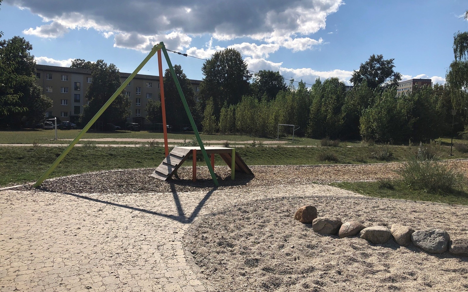The playground is located in a well-maintained, traffic-calmed area in Hoyerswerda and consists of several age-appropriate play areas. For toddlers, there is a play area with a small climbing frame, a slide, and various balancing and climbing elements. The ground is covered with fine sand, which provides additional safety. In the immediate vicinity is a double swing with a disc-shaped net seat, suitable for several children at the same time.