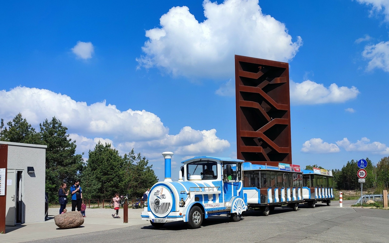 Visitors are introduced to the emerging Lusatian Lake District on a trip on the Seeschlange road train. The tourist train on wheels runs along the cycle paths, offering visitors views of the emerging lakes with their navigable canals and viewpoints. The trip includes a lively commentary from experts. The Seeschlange seats 42 visitors and features a ramp so that wheelchair-users and prams can also be transported.