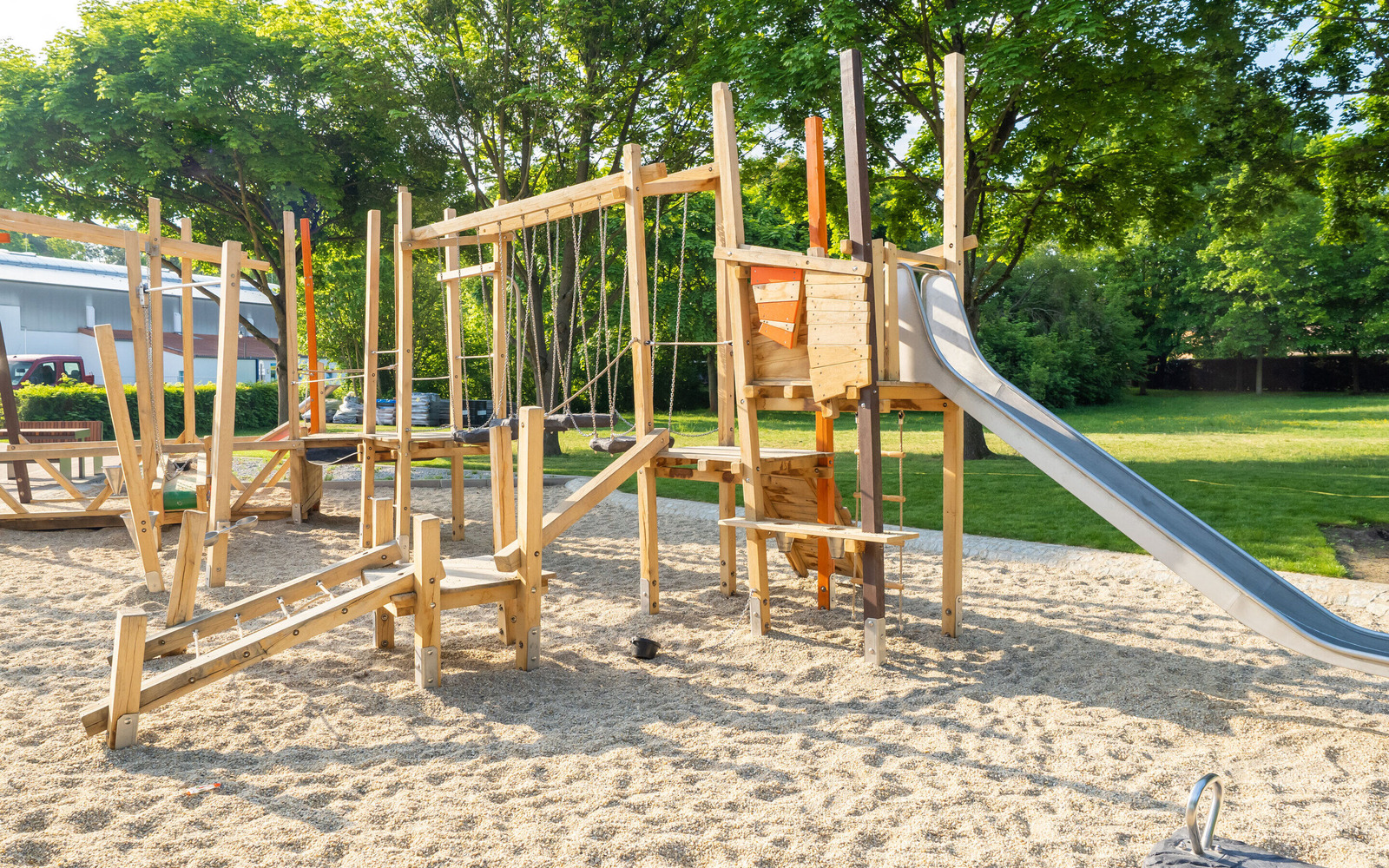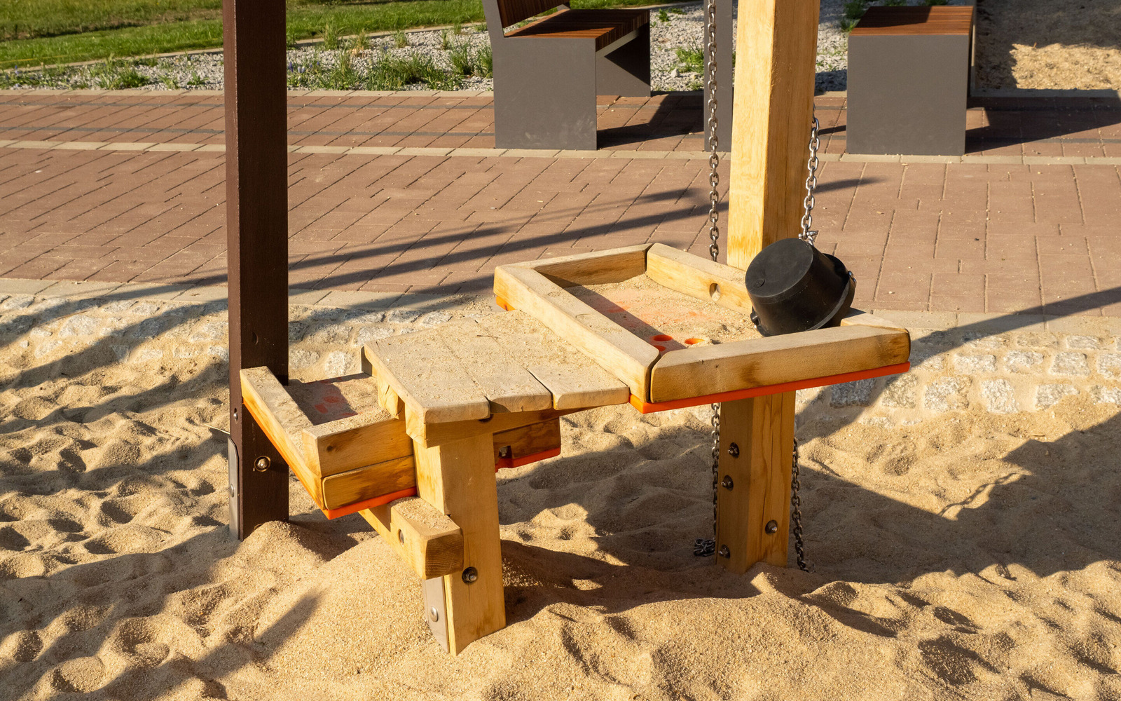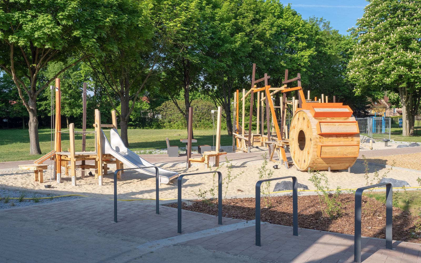 The newly designed playground at the Großkoschen lakeside beach is an exciting place where children up to the age of 12 can discover the mining history of Lusatia through play. Under the motto ‘Miner’, the facility incorporates key elements of former open-cast lignite mining in Lusatia. The highlight is a large bucket wheel excavator that can be climbed on. The offer is complemented by a conveyor ramp with a digging station, a wobbly coal slab bridge and a slide that recreates the removal of the coal. The design of the site is also reminiscent of open-cast mining: mounds in brown symbolise spoil heaps. The playground brings the structural change in the region to life in a child-friendly way.